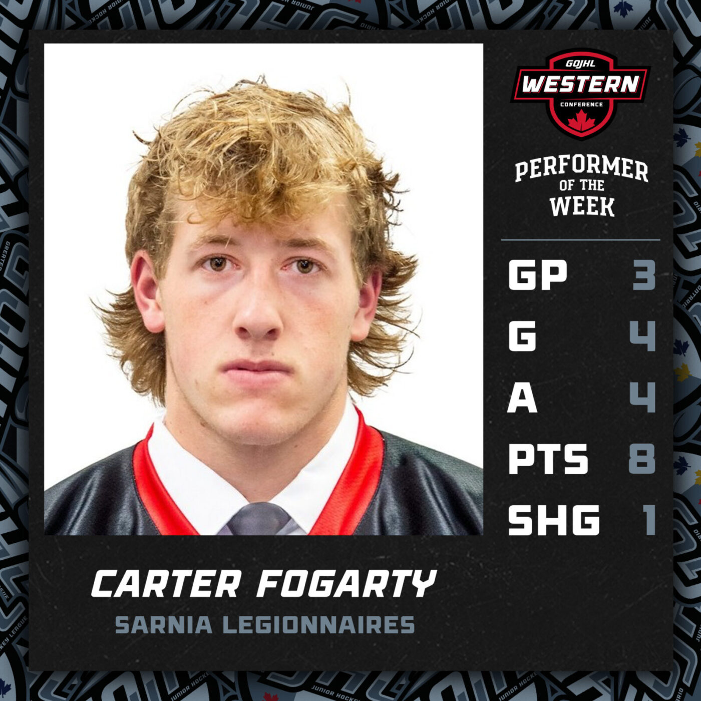 The rookie forward started the week by recording his 3rd hat-trick in a span of 8 games in Sarnia’s 6-1 win over Komoka on Family Day, and followed that up with a 3-point effort in a 7-5 loss to LaSalle on Thursday. The Sarnia native now leads all GOJHL rookies in scoring with 51 points, and he leads the Legionnaires in goals (26), assists (25) and power play goals (8).